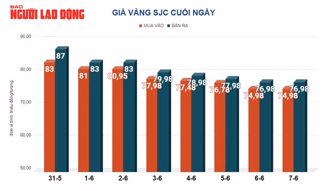 Giá vàng SJC ngày 7-6 tiếp tục giảm còn 76,98 triệu đồng/lượng. Giá vàng nhẫn do các Công ty SJC, PNJ sản xuất có giá 75,1 triệu đồng/lượng.