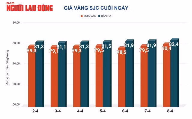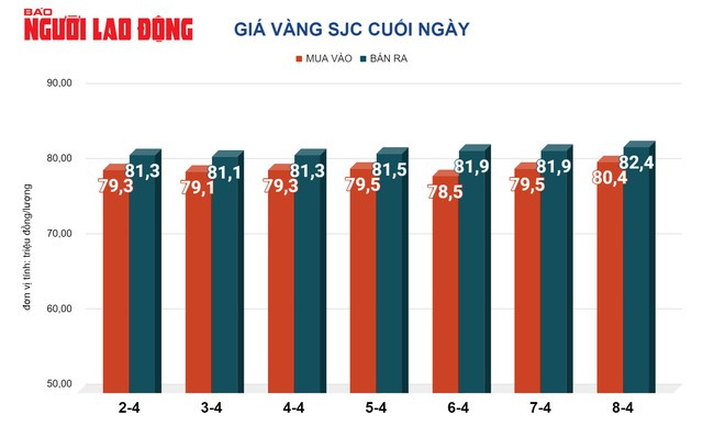 Trước đó, tại Việt Nam, giá vàng SJC trong ngày 8-4 tăng 700.000 đồng/lượng, chốt cuối ngày tại 82,4 triệu đồng/lượng.