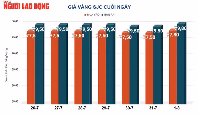 Tại Việt Nam, giá vàng SJC trong ngày 1-8 tăng 800.000 đồng/lượng để lao lên 79,8 triệu đồng/lượng. Giá vàng nhẫn do các công ty SJC, PNJ sản xuất cũng lên tới 77,55 triệu đồng/lượng.
