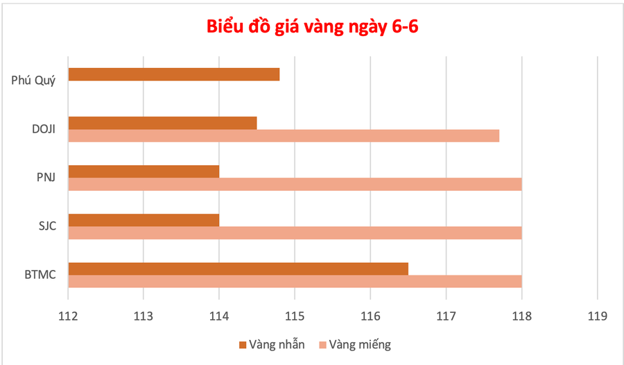 Các thương hiệu SJC, Bảo Tín Minh Châu cùng niêm yết giá vàng miếng mua-bán là 116-118 triệu đồng/lượng, tăng lần lượt 600.000 đồng và 300.000 đồng ở 2 chiều. Chênh lệch 2 chiều mua-bán là 2 triệu đồng.