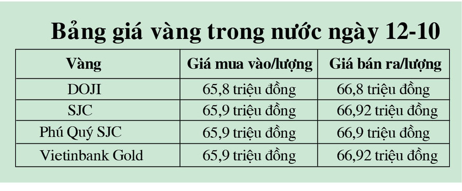 (GLO)- Theo nguồn tin từ Báo Công thương, website giavang.org, giá vàng ở thị trường trong nước ngày 12-10 giảm từ 300.000 đồng đến 700.000 đồng/lượng ở cả 2 chiều mua vào và bán ra so với phiên giao dịch ngày 11-10.