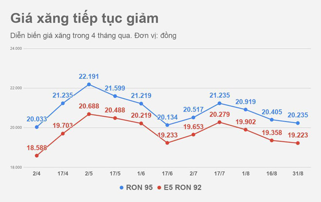 (GLO)- Liên Bộ Công thương-Tài chính điều chỉnh giá các loại xăng dầu đồng loạt giảm từ 15 giờ chiều 23-10, trong đó RON95-III xuống mức 19.726 đồng/lít.