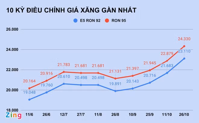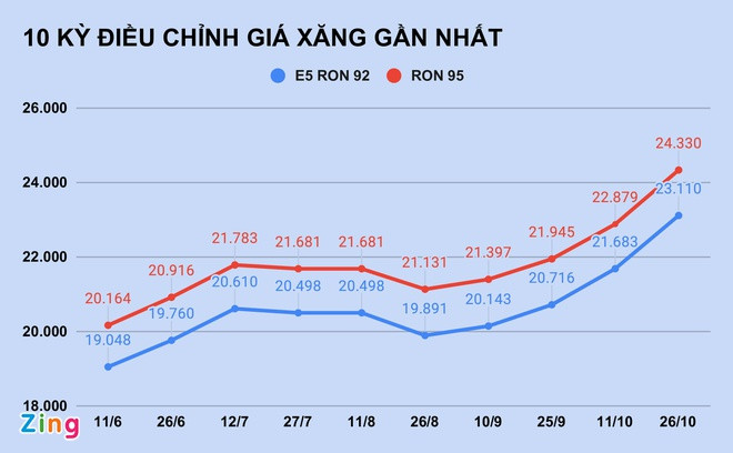 Từ 16h chiều 26/10, giá xăng E5 RON 92 trong nước tăng 1.430 đồng/lít lên 23.110 đồng/lít, cao nhất kể từ tháng 9/2014. Trong khi đó, xăng RON 95 tăng thêm 1.460 đồng/lít.