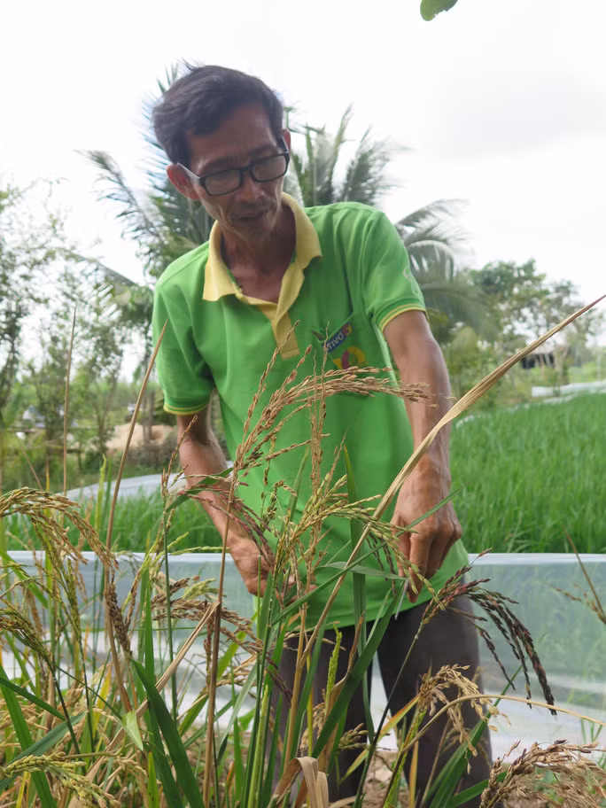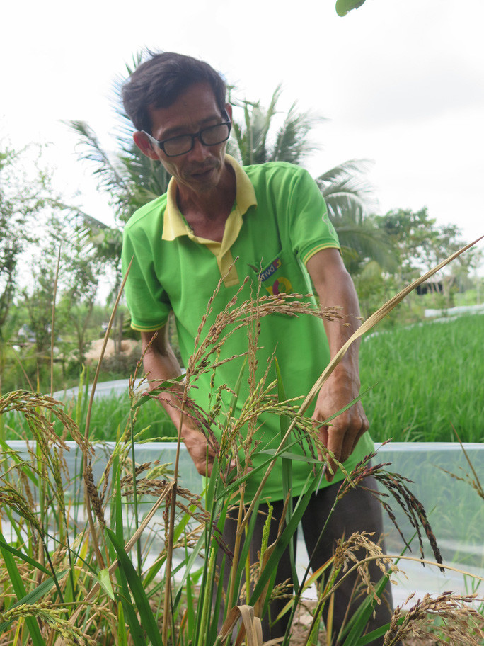 | Anh Hoa Sĩ Hiền và một giống lúa chịu mặn do anh lai tạo thành |