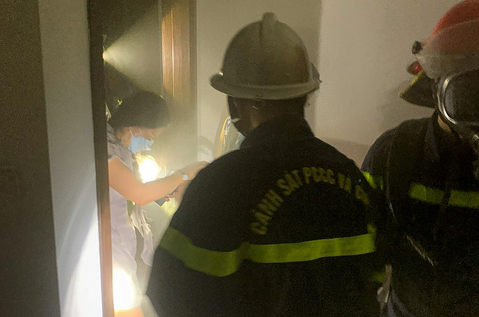 Lực lượng chức năng cùng người dân triển khai bình bột dập tắt đám cháy, đồng thời cử cán bộ chiến sĩ đeo bình thở mở lối thoát khói tiếp cận sân thượng hỗ trợ giải cứu những người mắc kẹt trong căn nhà.