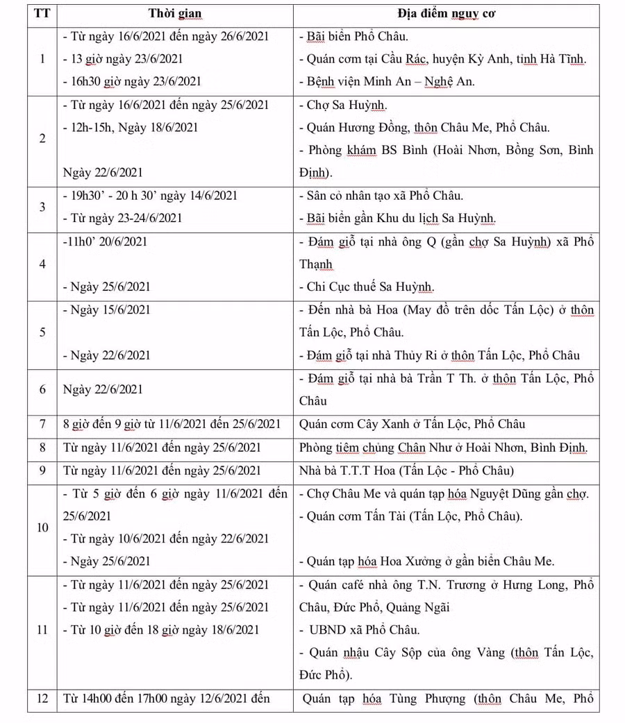 | Danh sách các địa điểm liên quan đến bệnh nhân COVID-19 trên địa bàn Quảng Ngãi. |