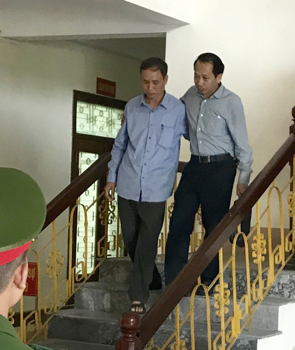 Bị cáo Phạm Văn Khuông, nguyên phó giám đốc Sở Giáo dục và Đào tạo Hà Giang, được ông Trần Đức Quý, phó chủ tịch UBND tỉnh (người cũng bị kỷ luật trong vụ việc này) dìu khỏi phòng xử án hồi tháng 9-2019 - Ảnh: N.V.HẢI