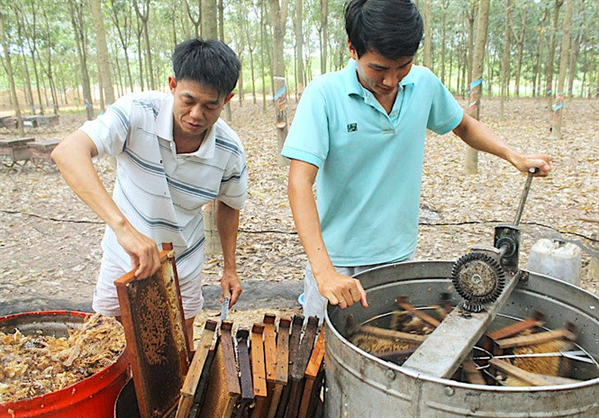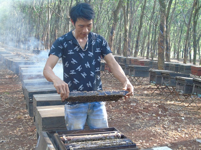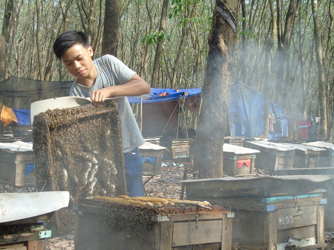 Mùa cạo mủ cao su ở xã Thuận Phú, huyện Đồng Phú, tỉnh Bình Phước đã xong nên vắng bóng người. Bên dưới tán cây là đàn ong thợ hàng chục ngàn con đang tấp nập bay đi bay về, cần mẫn làm mật. Thấp thoáng trong vườn cây, là những lán trại được dựng tạm với vách nứa, mái bạt nilong, trống trước hở sau của những người nuôi ong. Họ là dân nuôi ong du mục, mới từ Bình Thuận vào đây.