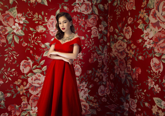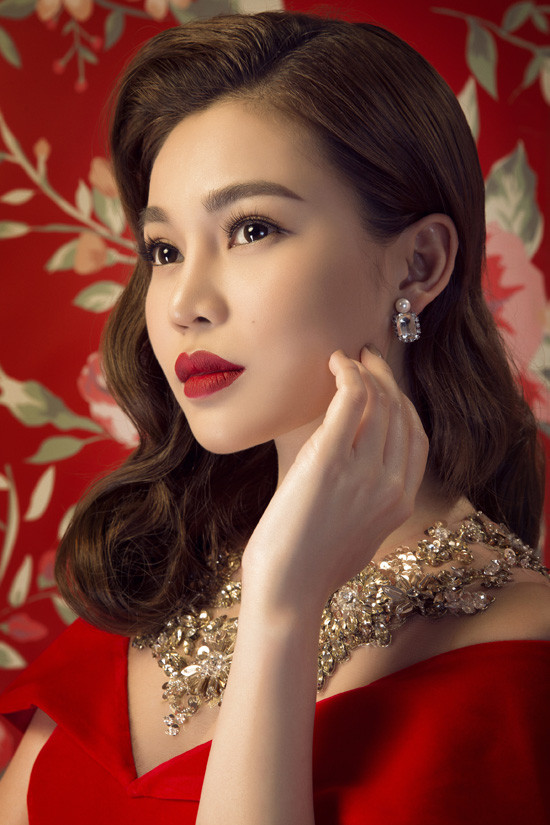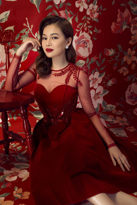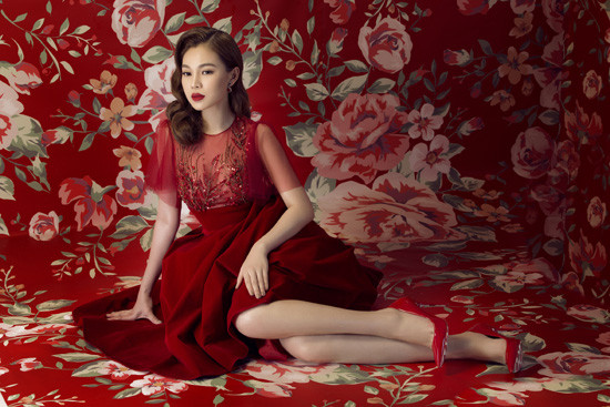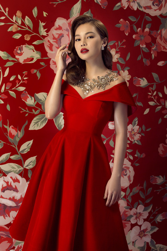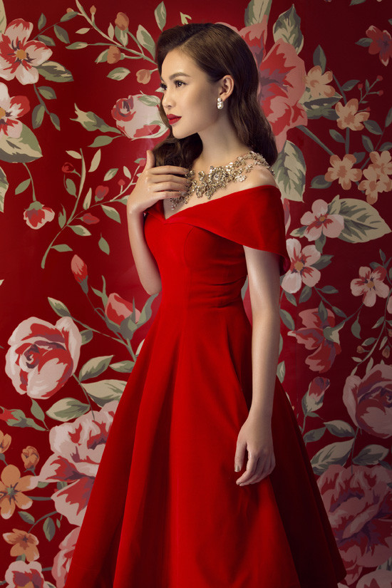 Người đẹp 27 tuổi chọn những bộ trang phục đỏ rực - màu biểu trưng cho một năm mới may mắn để diện trong những shoot ảnh. Màu đỏ còn làm tăng thêm nét trắng sáng nuột nà của Giang Hồng Ngọc. Thiết kế hở vai, khoe khéo thềm ngực đầy hay phối ren gợi cảm, xẻ cao khoe chân thon trong những chiếc đầm quý phải của Lê Thanh Hòa - Tuấn Trần càng làm Giang Hồng Ngọc bội phần quyến rũ.