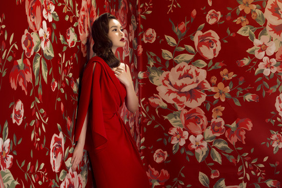 Thay vì tạo dáng bên quất đào mai quen thuộc, Giang Hồng Ngọc và nhiếp ảnh Lê Thiện Viễn quyết định tạo bối cảnh sang trọng, đơn giản trên nền chăn hoa hồng. Chăn hoa hồng, con công từng là thứ in đậm trong ký ức những người từng qua bao cấp, khi mỗi mét chăn đều vô cùng quý giá, được dành dụm tặng cho những đôi uyên ương mới, giờ bống mốt trở lại trong xu hướng thời trang, trưng bày của giới trẻ. Nền đỏ của hoa hồng càng tôn thêm sắc đỏ thắm nồng nàn quyến rũ của Giang Hồng Ngọc.