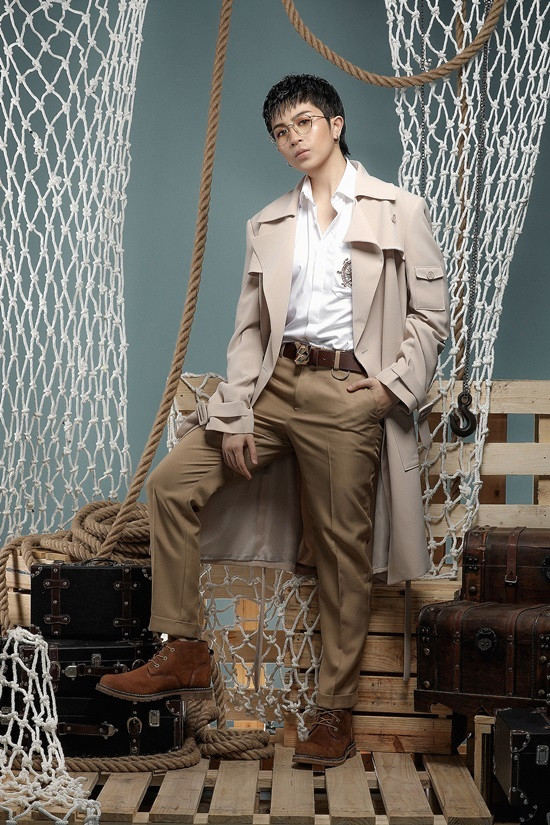 | Trong bộ ảnh "Journey of Meuw", Gil Lê chọn gu mặc bụi bặm. Bối cảnh với các đạo cụ như lưới, dây thừng, bè gỗ, rương... tạo không khí phiêu lưu và khám phá. |