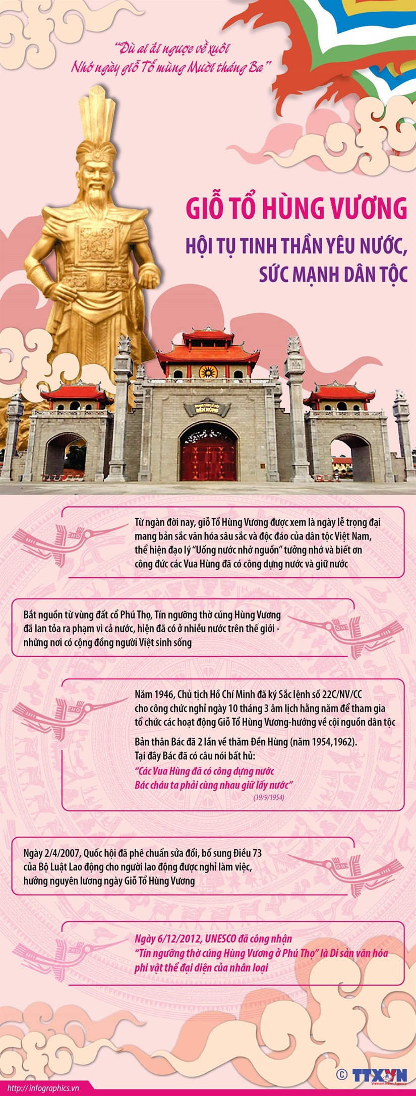 Mọi người dân Việt Nam đều tự hào mang trong mình dòng máu Lạc Hồng. Giỗ Tổ Hùng Vương và Lễ hội Đền Hùng là một trong những ngày lễ trọng đại của dân tộc Việt Nam.