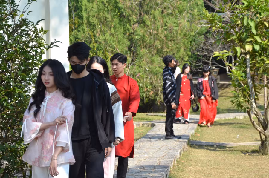Cận Tết Nguyên Đán 2025, thời điểm này, nhiều bạn trẻ tại Đà Lạt xúng xính áo dài đến chùa Lâm Tỳ Ni chụp ảnh đón Tết.