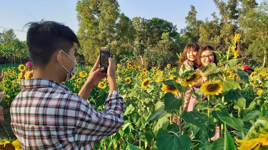 | Hai bạn trẻ đang “sống ảo” cùng những đóa hoa hướng dương rực rỡ - ẢNH: HOÀNG TRUNG |