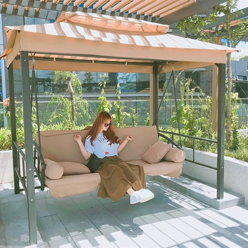 Không chỉ có nhiều cây xanh mát mắt thác nước, "vườn thượng uyển" của TTTM Takashimaya có thêm xích đu, bàn ghế ngồi thư giãn hít thở khí trời tựa như khu vườn trong mơ.