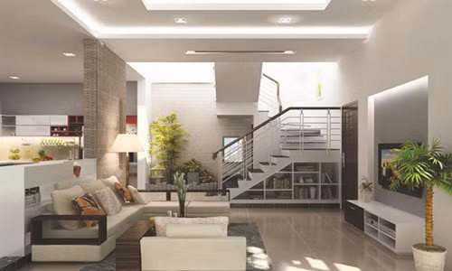 Nhà ống thường bố trí tầng 1 là phòng khách, phòng ăn và nhà bếp. Nếu không gian cho phép, bạn nên bố trí thêm cây xanh trong phòng khách.