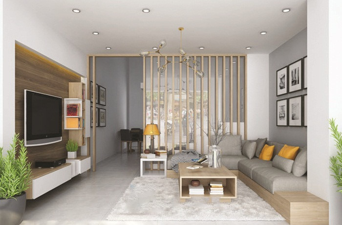 Trang trí phòng khách nhà ống là một trong những giải pháp hiệu quả giúp mở ra không gian mới, ấn tượng và độc đáo. Bạn có thể đặt cây xanh, bình phong, kệ...trong góc phòng hay sử dụng đèn trang trí trên trần nhà.