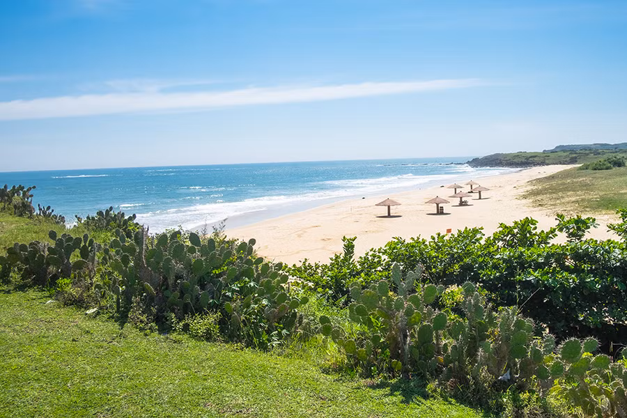 Gần đó còn có ngôi làng chài nhỏ bình yên. Tất cả con đường của làng đều hướng ra biển. Đi qua các khúc quanh và những ngôi nhà cửa sơn xanh nổi bật trên tường vôi trắng, bạn sẽ thấy mặt biển sẽ hiện ra cuối dốc; ghe tàu, thúng chai của ngư dân đậu san sát. Đây còn là một trong những bãi cát có tên trong danh sách bảo tồn bãi rùa đẻ.