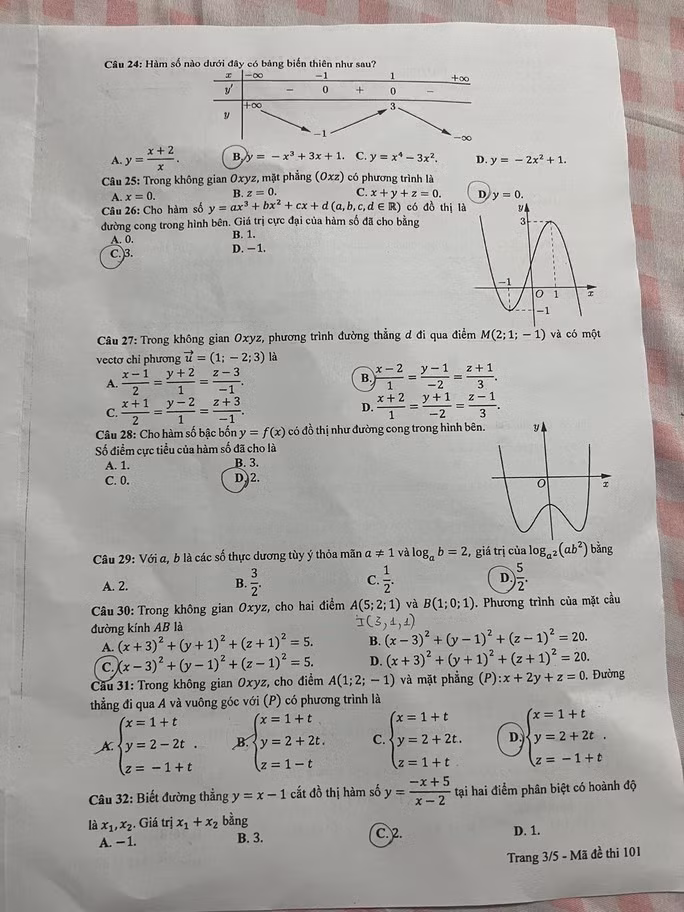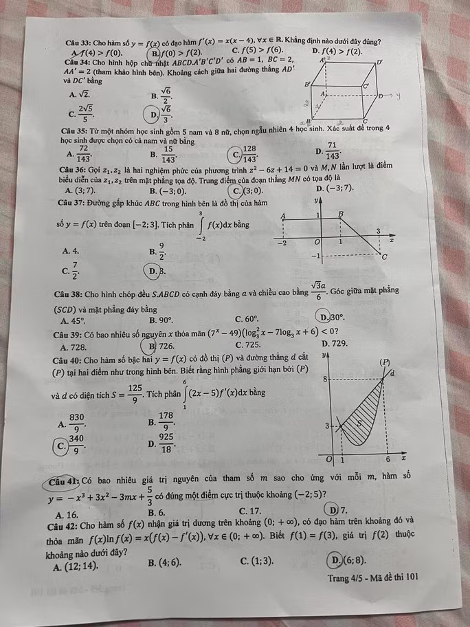 Đề thi môn Toán tốt nghiệp THPT năm 2023, mã đề 101