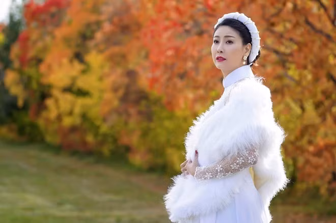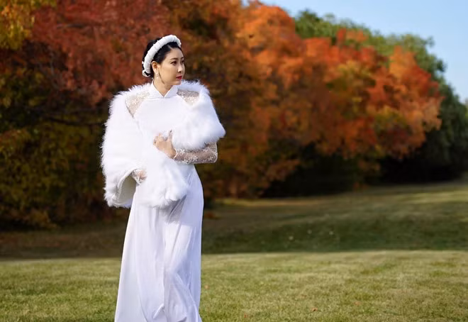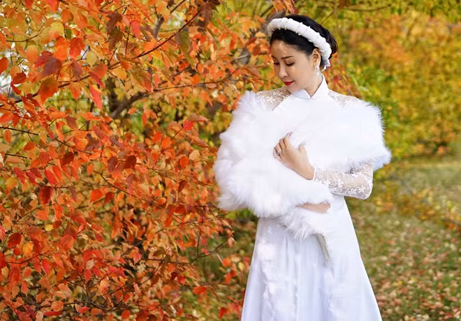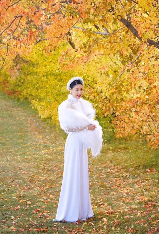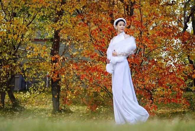 Trong bộ ảnh được thực hiện nhân ngày Phụ nữ Việt Nam, hoa hậu diện áo dài lụa trắng, tóc vấn tản bộ giữa khung cảnh mùa thu lãng mạn.