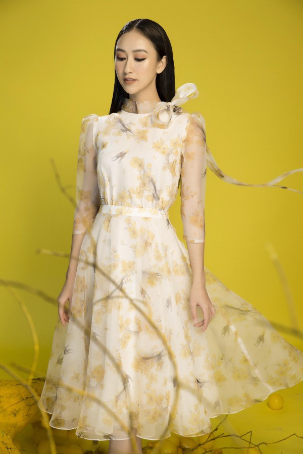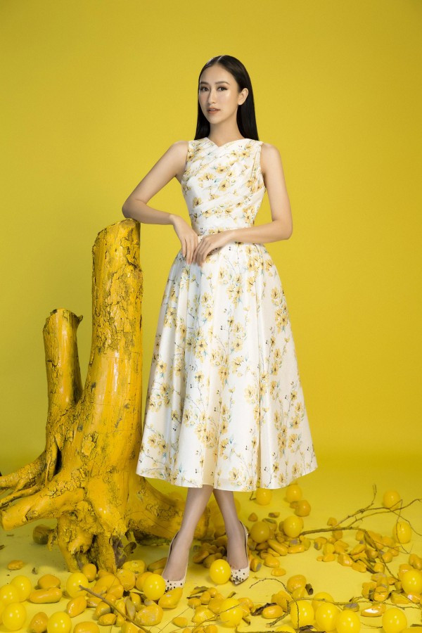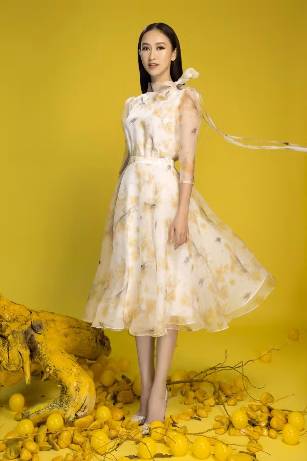 Trong không gian tràn ngập sắc xuân, nàng á hậu khoe nét dịu dàng với những thiết kế sang trọng.