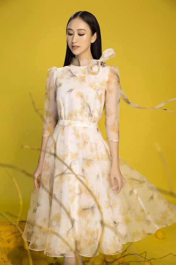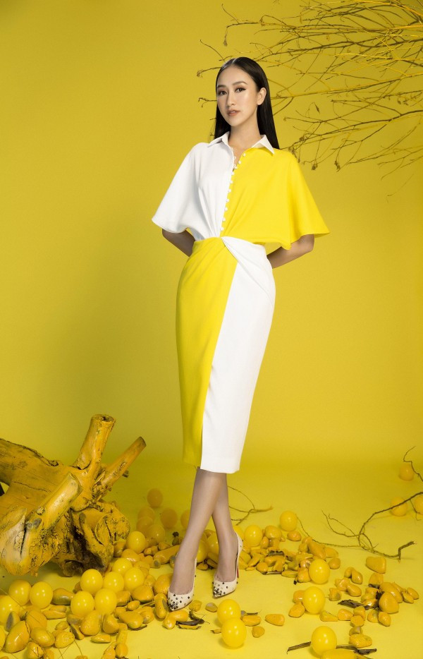Lấy ý tưởng từ sắc vàng rực rỡ của hoa Mai, loài hoa biểu tượng của những ngày Tết phương Nam, Lê Thanh Hòa đã tạo nên những thiết kế tinh tế, thanh lịch giúp á hậu Hà Thu khoe sắc rạng rỡ trong những ngày Xuân đang cận kề.