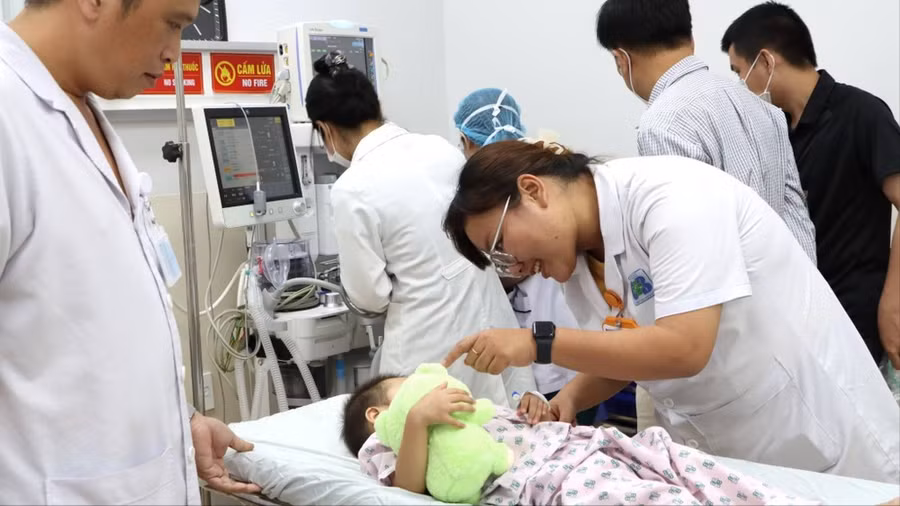 Tại Bệnh viện Nhi Trung ương (Hà Nội), trẻ được điều trị với phác đồ cập nhật nhất, phẫu thuật lấy phần lớn bướu, hóa trị 9 đợt nhưng vẫn còn tồn lưu bướu trên vi thể. Bệnh nhi quá nhỏ, vị trí bướu sâu, không thể phẫu thuật vì nguy cơ để lại rất nhiều di chứng. Lựa chọn tốt nhất lúc này là xạ trị áp sát khu trú vào nền bướu còn tồn lưu.