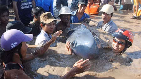 Ông Hồ Đăng Bảy, ở thôn Đức Trung, xã Đức Trạch - người phát hiện ra hai con cá voi này cho biết: Vào khoảng 20 giờ ngày 22-12, khi đang đi kiểm tra tàu thuyền neo đậu trên bãi biển thì phát hiện một con cá voi chiều dài khoảng 1,2m, nặng khoảng 20 kg bơi dạt vào bờ biển. Các ngư dân trong xã đã tìm cách giải cứu và đưa cá ra xa bờ để bơi đi nhưng sau khoảng 15 lần giải cứu, cá đều bơi ngược trở lại vào bờ nên mọi người đã đưa cá lên bờ chăm sóc.