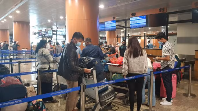 | Hành khách xếp hàng làm thủ tục tại sân bay Yangon (Myanmar) |