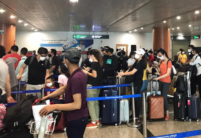 | Hành khách thực hiện giãn cách tại khu vực nhập cảnh và kiểm tra y tế ở sân bay Đà Nẵng. |
