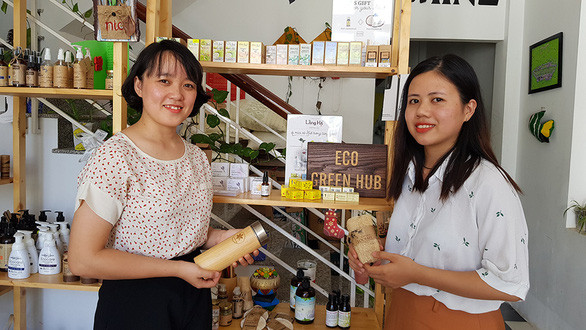 | Thu Hương (trái) và Ngọc Trâm bên các sản phẩm thân thiện môi trường có trong hệ sinh thái xanh của mình - Ảnh: CÔNG TRIỆU |