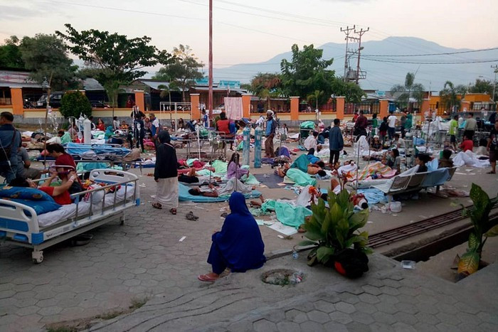 Những người bị thương do trận động đất được điều trị trước một bệnh viện ở Palu, miền Trung Sulawesi, hôm 29/9 do lo ngại dư chấn có thể xảy ra. Ảnh: JP.