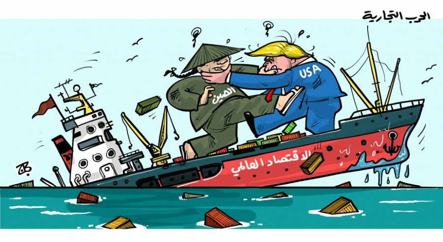 Xung khắc thương mại Mỹ - Trung tác điộng đến “con tàu” kinh tế thế giới. (Tranh biếm họa của tác giả Emad Hajjaj - báo Jordan)