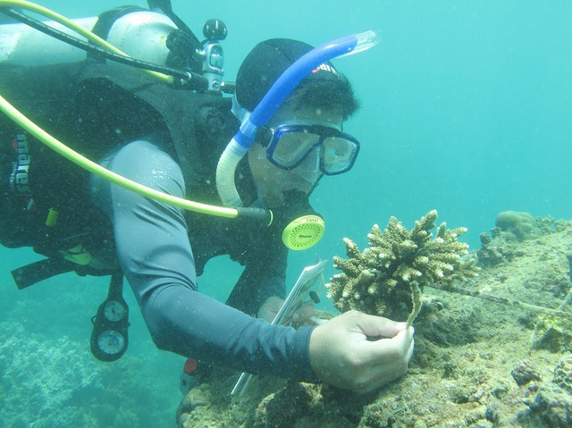 | Đo tốc độ tăng trưởng và ghi chép lại kích thước tăng trưởng của các tập đoàn san hô. Ảnh: BQL KBTB Cù Lao Chàm cung cấp |