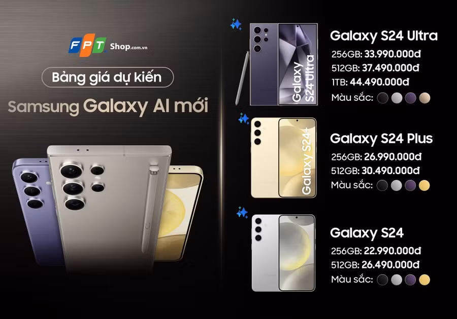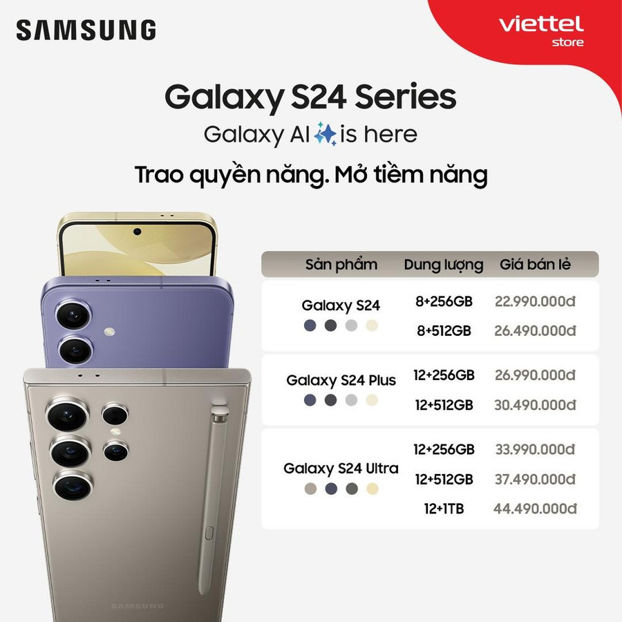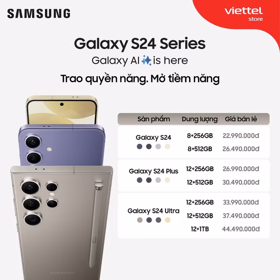 Theo đó, Galaxy S24 Ultra có giá bán từ 33,99 triệu đồng, Galaxy S24 Plus có giá từ 26,99 triệu đồng và Galaxy S24 có giá từ 22,99 triệu đồng.