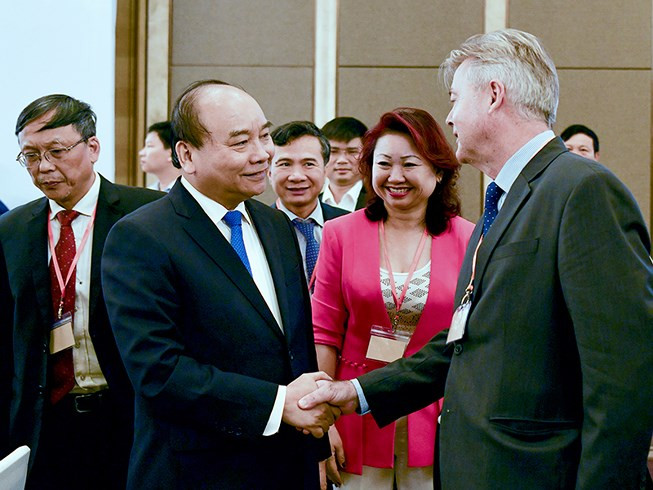 Thủ tướng Nguyễn Xuân Phúc trò chuyện với các đại biểu dự diễn đàn. Ảnh: VGP