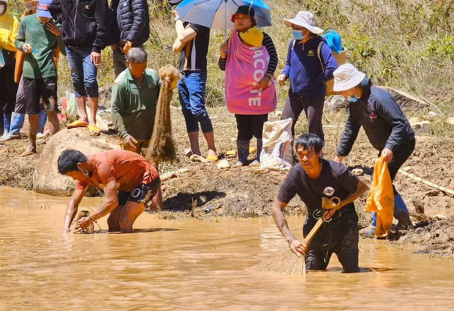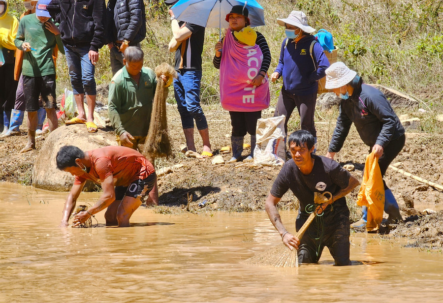 | Hồ cạn nước, hàng trăm người men theo dòng nước cạn chảy về đập để bắt cá. Cá chủ yếu ở đây là cá trê, cá trắm, cá mè, cá trôi... |