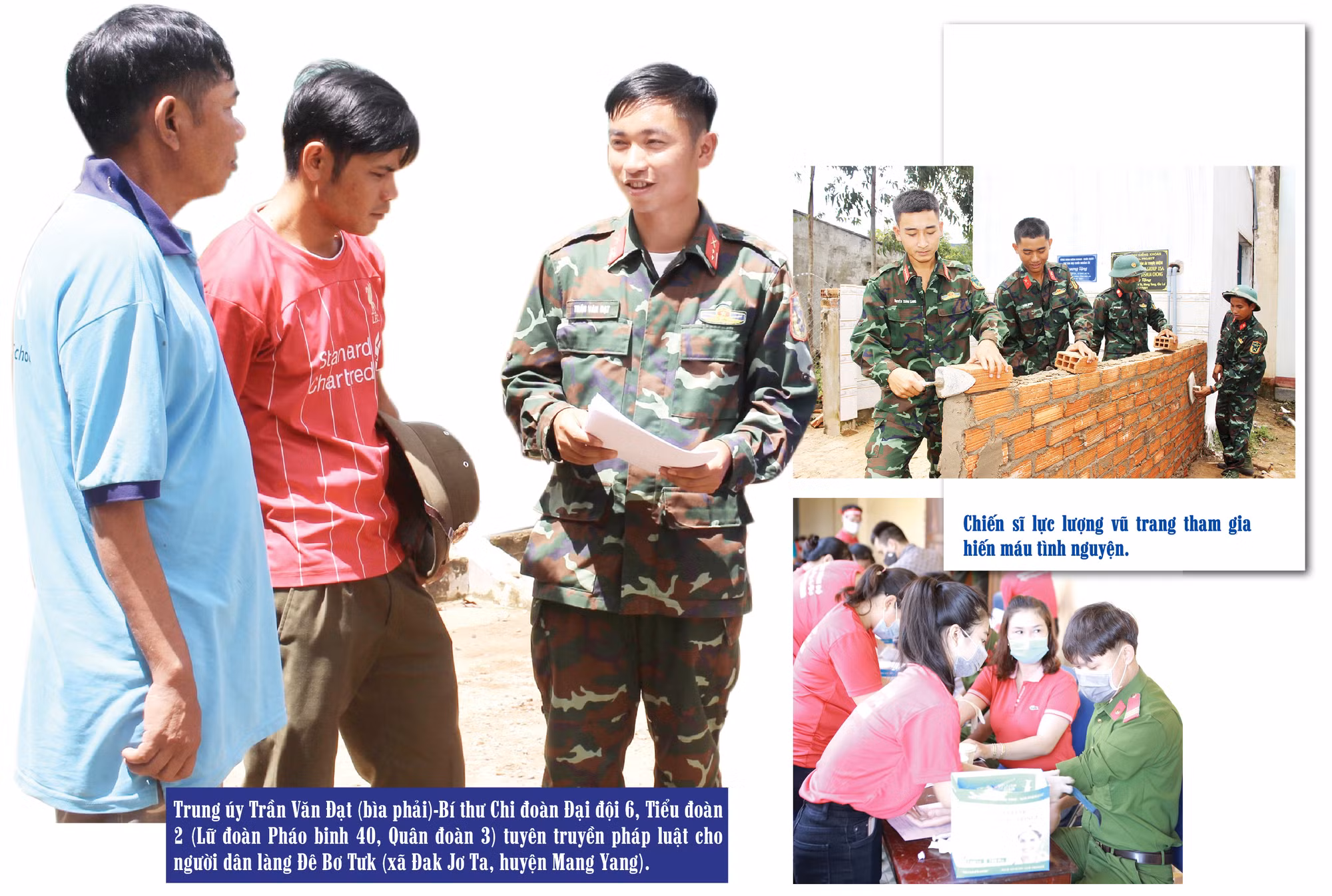 Các chiến sĩ chia thành từng tốp nhỏ để thực hiện nhiệm vụ. Ban ngày, các anh phát quang bụi rậm, dọn vệ sinh, làm đường giao thông, trồng cây xanh. Chiều đến, các anh cắt tóc miễn phí cho người dân và các em nhỏ. Đêm về, các chiến sĩ tranh thủ đến từng nhà tuyên truyền, hướng dẫn bà con cách giữ gìn vệ sinh, cảnh quan môi trường, phân loại xử lý rác tại nhà; tuyên truyền về Luật Nghĩa vụ quân sự, Luật Giao thông đường bộ. Bên cạnh đó, các chiến sĩ còn dựng sân khấu tổ chức đêm giao lưu văn nghệ hoặc chiếu phim phục vụ bà con. Anh Nông Văn Đạo-Bí thư Chi bộ làng Đê Bơ Tưk-chia sẻ: “Nhờ các chiến sĩ về tình nguyện mà mấy tuyến đường trong làng sạch sẽ hơn. Bà con cũng được các chiến sĩ thông tin nhiều kiến thức bổ ích để vận dụng vào cuộc sống”.