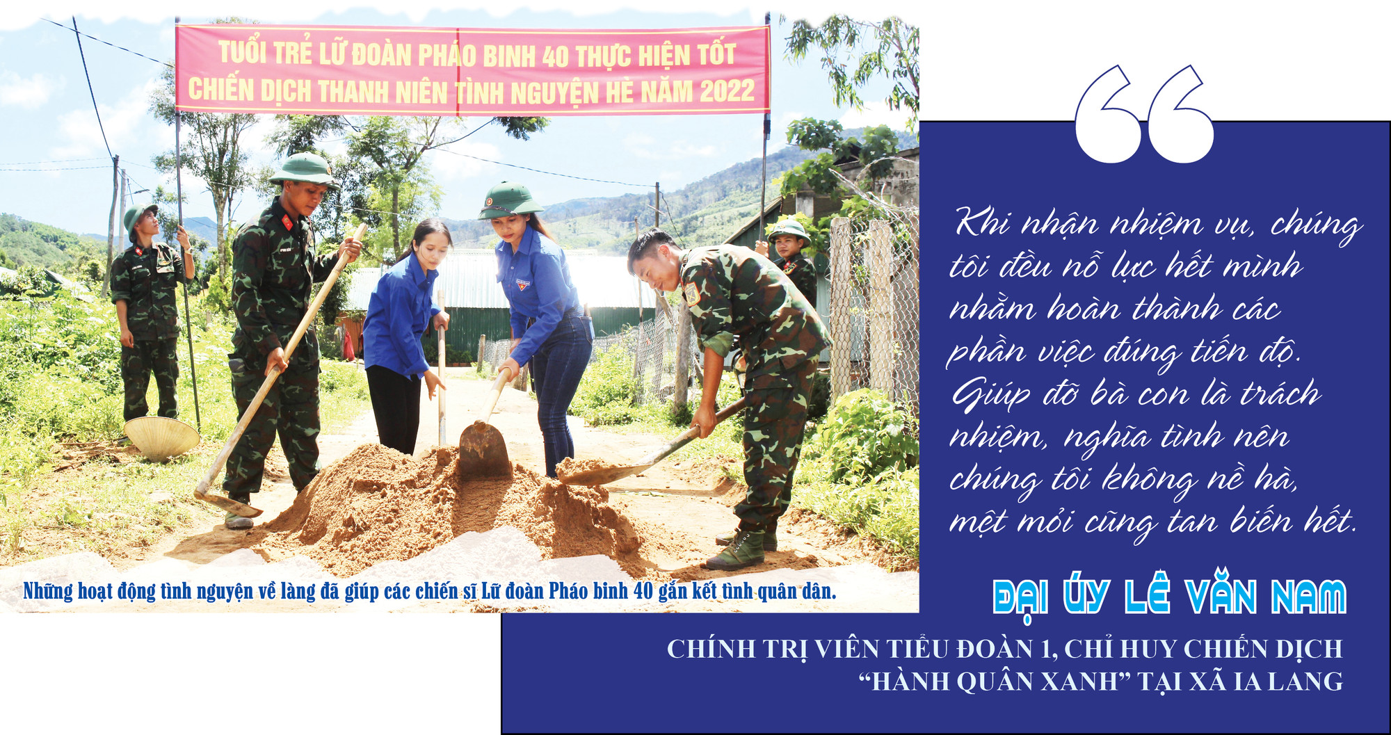 Sự hiện diện của các chiến sĩ tình nguyện của Tiểu đoàn 2 (Lữ đoàn Pháo binh 40) khiến cho người dân làng Đê Bơ Tưk vui hẳn lên. Chiến dịch “Hành quân xanh” năm nay được Tiểu đoàn triển khai từ ngày 15 đến 22-7 với sự tham gia của 20 cán bộ, chiến sĩ. Chia sẻ lý do chọn làng Đê Bơ Tưk làm điểm đến của chiến dịch, Thiếu tá Nguyễn Hữu Hạnh-Trợ lý dân vận Lữ đoàn Pháo binh 40-cho hay: “Làng Đê Bơ Tưk là 1 trong 2 làng khó khăn nhất của huyện Mang Yang. Xã Đak Jơ Ta cũng là đơn vị kết nghĩa với Lữ đoàn 40. Chính vì thế, đơn vị giúp đỡ bà con bằng những hoạt động thiết thực”.