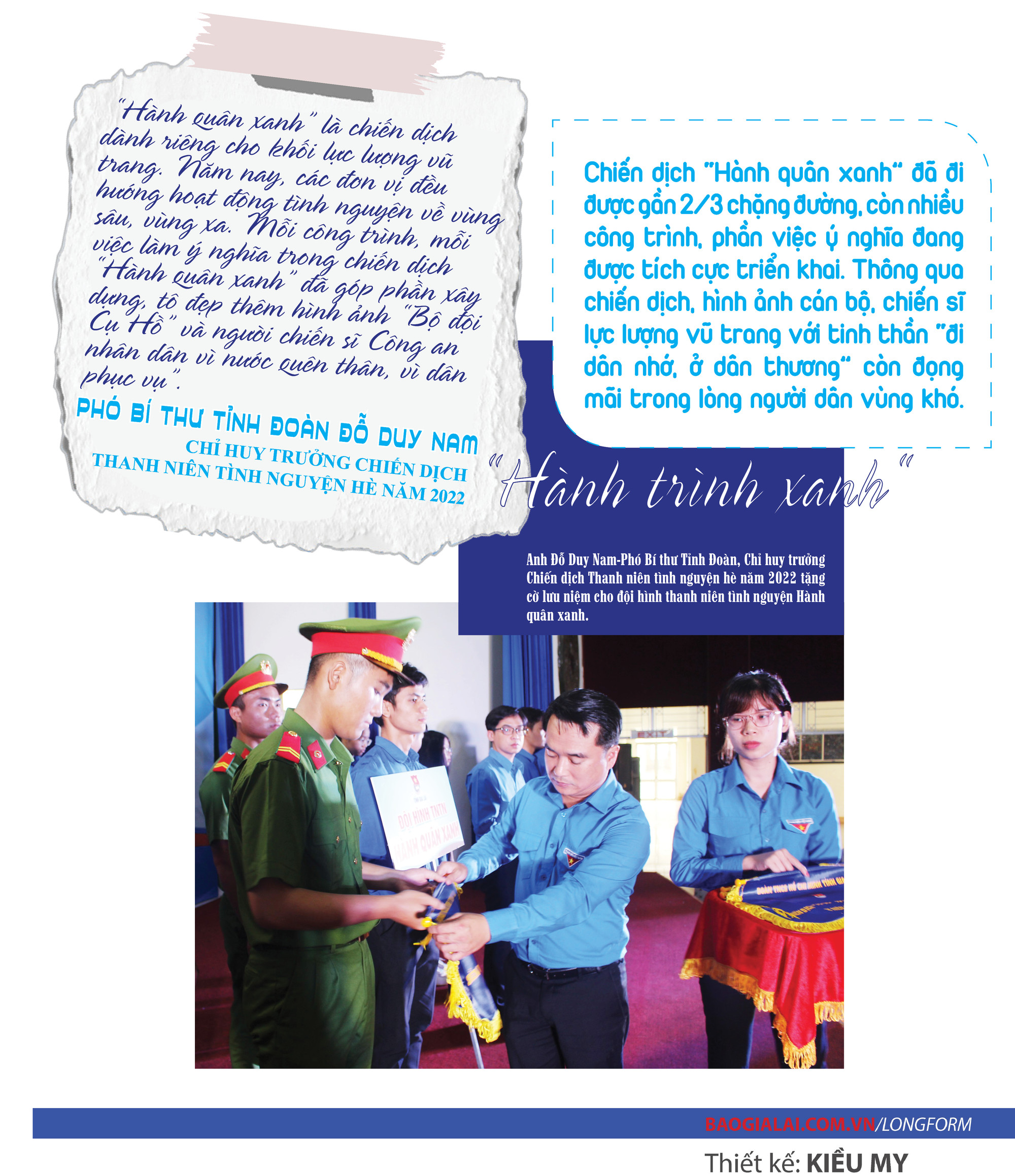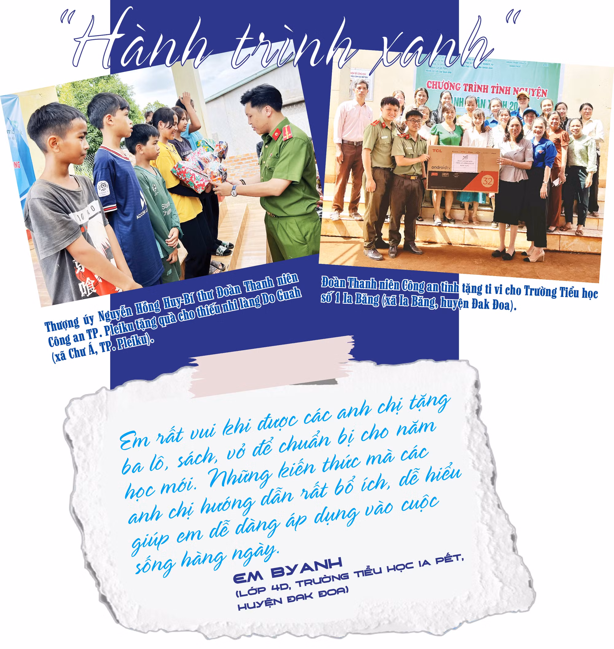 Bên cạnh lực lượng Quân đội, các chiến sĩ Công an cũng triển khai nhiều chương trình, hoạt động ý nghĩa trong chiến dịch “Hành quân xanh”. Cuối tháng 6-2022, Đoàn Thanh niên, Hội Phụ nữ khối An ninh nhân dân, Đoàn cơ sở Phòng cháy chữa cháy và Cứu nạn cứu hộ (Công an tỉnh) phối hợp Đoàn cơ sở Công an huyện Đak Đoa “hành quân” về xã Ia Băng và Ia Pết (huyện Đak Đoa) mang theo những phần quà nghĩa tình tặng học sinh nghèo. Đoàn cơ sở Phòng cháy chữa cháy và Cứu nạn cứu hộ tổ chức tập huấn kỹ năng phòng cháy-chữa cháy, sơ cứu, phòng-chống tai nạn thương tích và đuối nước cho thiếu nhi trên địa bàn. Cùng với đó, Đoàn Thanh niên Công an tỉnh tặng 2 ti vi cho Trường Tiểu học số 1 Ia Băng và Trường Tiểu học Ia Pết; phối hợp với các Mạnh Thường Quân tặng 300 phần quà cho học sinh.