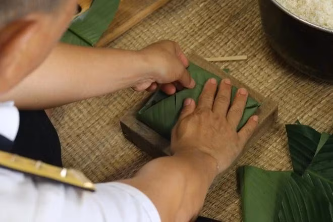 Bằng đôi bàn tay khéo léo, tỉ mẩn xếp từng chiếc lá vào khuôn bánh, chẳng mấy chốc, bánh chưng xanh vuông vắn được hình thành. Tiếng cười nói rộn ràng hòa cùng những câu chuyện quê nhà được kể lại khiến không khí càng ấm cúng hơn.