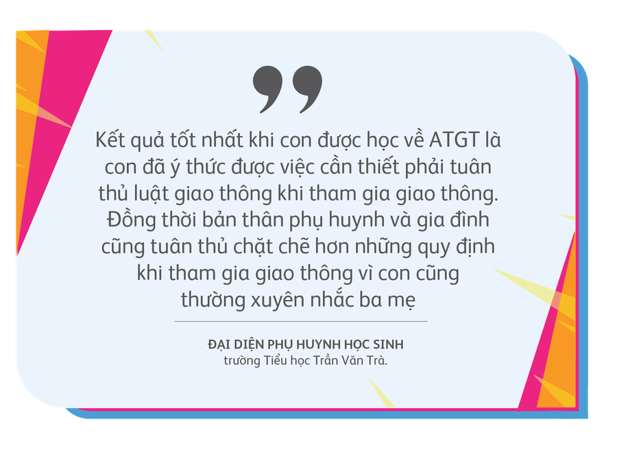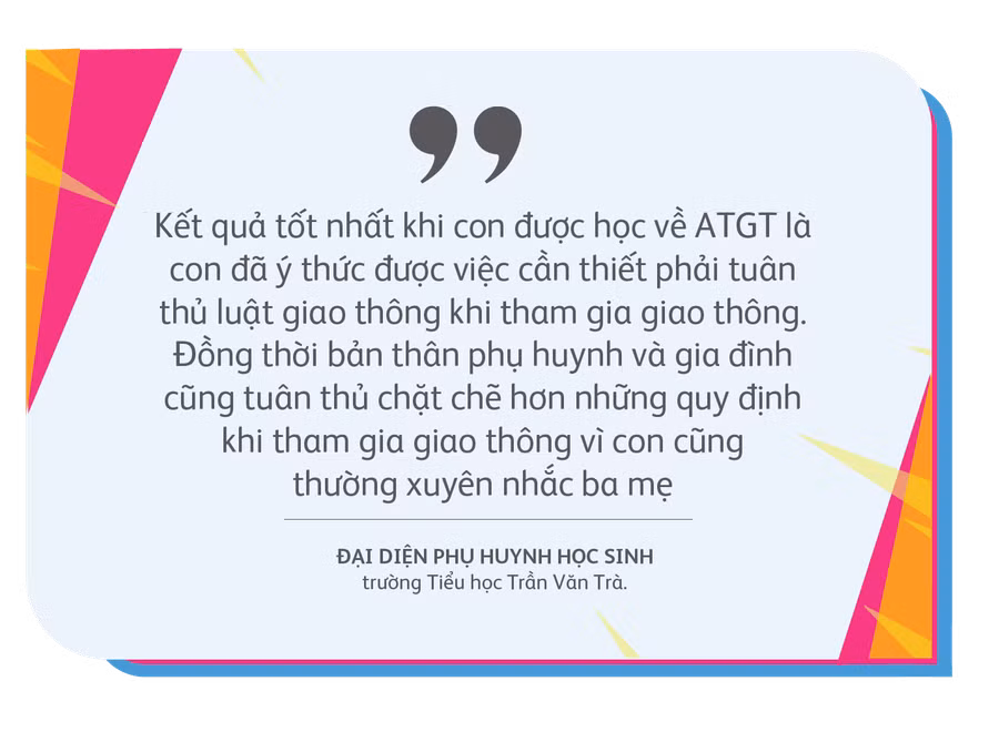 Ba năm không phải là một chặng đường quá dài nhưng hành trình mà “Đến trường an toàn” đã đi qua chắc chắn chứa đựng rất nhiều cảm xúc của những người làm dự án và cả những bậc thầy cô, cha mẹ. Với những kết quả đáng mừng được ghi nhận, dự án nhận được rất nhiều sự đồng tình ủng hộ từ các bậc phụ huynh. Một đại diện phụ huynh học sinh của Trường Tiểu học Trần Văn Trà cho biết dự án đã giúp các con có ý thức tốt hơn về việc tuân thủ Luật Giao thông đường bộ và cũng thường xuyên nhắc nhở ba mẹ cùng làm theo những bài học được dạy trên lớp.