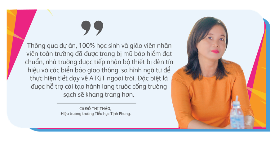 Là đơn vị phụ trách khâu tổ chức Ngày hội An toàn Giao thông năm nay, cô Đỗ Thị Thảo-Hiệu trưởng Trường Tiểu học Tịnh Phong vui mừng khi sự kiện diễn ra tốt đẹp, mang đến những giây phút học tập, vui chơi thiết thực cho các em. Cô Thảo cho biết nhờ có dự án, 100% học sinh và giáo viên, nhân viên toàn trường đã được trang bị mũ bảo hiểm đạt chuẩn, nhà trường cũng được tiếp nhận bộ thiết bị đèn tín hiệu và các biển báo giao thông, sa hình ngã tư để thực hiện các tiết dạy về an toàn giao thông ngoài trời. Đặc biệt hơn cả là nhà trường đã được hỗ trợ ngân sách cải tạo hành lang trước cổng trường sạch sẽ khang trang hơn.