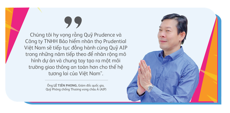 Để tạo nên sự thay đổi tích cực đó, dự án đã nhận được sự đồng hành và hỗ trợ nhiệt tình từ Quỹ Phòng-chống Thương vong châu Á (AIP) và các tổ chức liên quan như Ủy Ban An toàn Giao thông quốc qia, Bộ Giáo dục và Đào tạo cùng các đối tác tại địa phương. Ông Lê Tiên Phong-Giám đốc quốc gia Quỹ AIP-chia sẻ: “Chúng tôi hy vọng rằng Quỹ Prudence và Công ty TNHH Bảo hiểm nhân thọ Prudential Việt Nam sẽ tiếp tục đồng hành cùng Quỹ AIP trong những năm tiếp theo để nhân rộng mô hình dự án và chung tay tạo ra một môi trường giao thông an toàn hơn cho thế hệ tương lai của Việt Nam".