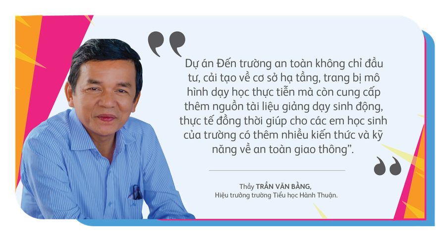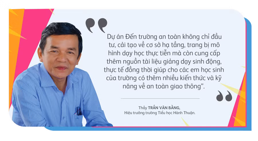 Cũng là một trong những trường học nằm trong danh sách triển khai dự án trong năm 2023, thầy Trần Văn Bằng-Hiệu trưởng Trường Tiểu học Hành Thuận không giấu được sự vui mừng khi dự án “Đến trường an toàn” không chỉ đầu tư, cải tạo về cơ sở hạ tầng, trang bị mô hình dạy học thực tiễn mà còn cung cấp thêm nguồn tài liệu giảng dạy sinh động và thực tế, giúp cho các em học sinh của trường có thêm nhiều kiến thức và kỹ năng tham gia giao thông an toàn.