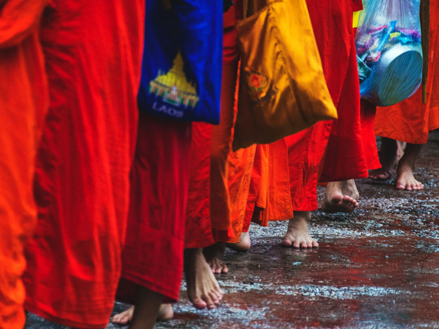 Và điều đặc biệt nhất không thể bỏ lỡ. Đó là lễ khất thực truyền thống tak bat. 5 giờ sáng, từ cổng chùa, các nhà sư vai khoác giỏ, chân trần bước trên phố, đi khất thực nhận đồ cúng dường của người dân. Dẫn đầu là vị sư trụ trì, theo vai vế đến các nhà sư mới tu, cuối cùng là những chú tiểu, và song hành luôn có những chú chó tinh khôn. Như một dải lụa màu vàng cam dài bất tận, hàng dài các nhà sư cứ lặng lẽ lướt qua hàng người đang quỳ trên hè phố, tay dâng lên xôi nếp, bánh kẹo, trái cây.