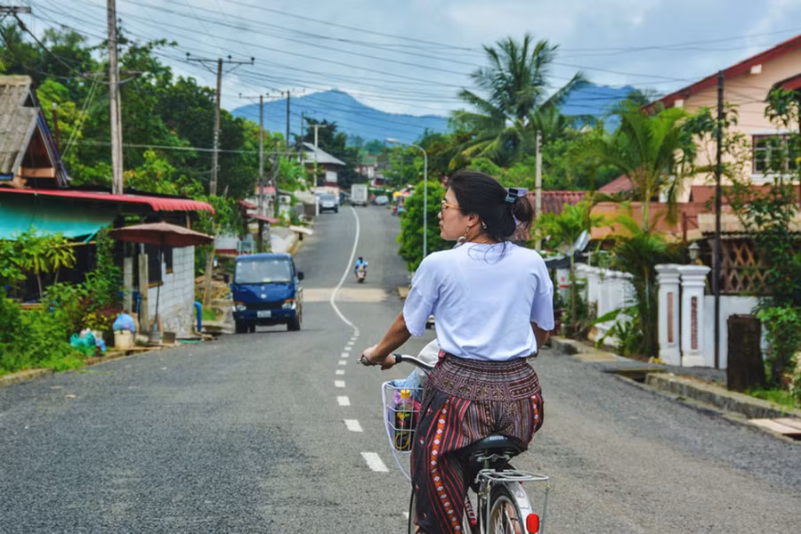 Để khám phá Luang Prabang nhiều hơn, hãy thuê một chiếc xe đạp. Vòng bánh xe dẫn chúng tôi dọc sông Nam Khan, đến với những ngôi làng làm giấy saa, dệt lụa truyền thống khuất dưới tán cây mát rượi.