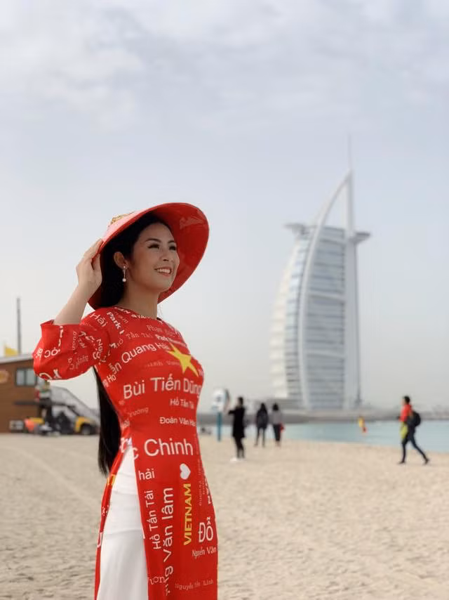 | Cô gây chú ý khi mặc áo dài đỏ, in tên các cầu thủ tại Dubai. Ảnh: NVCC. |