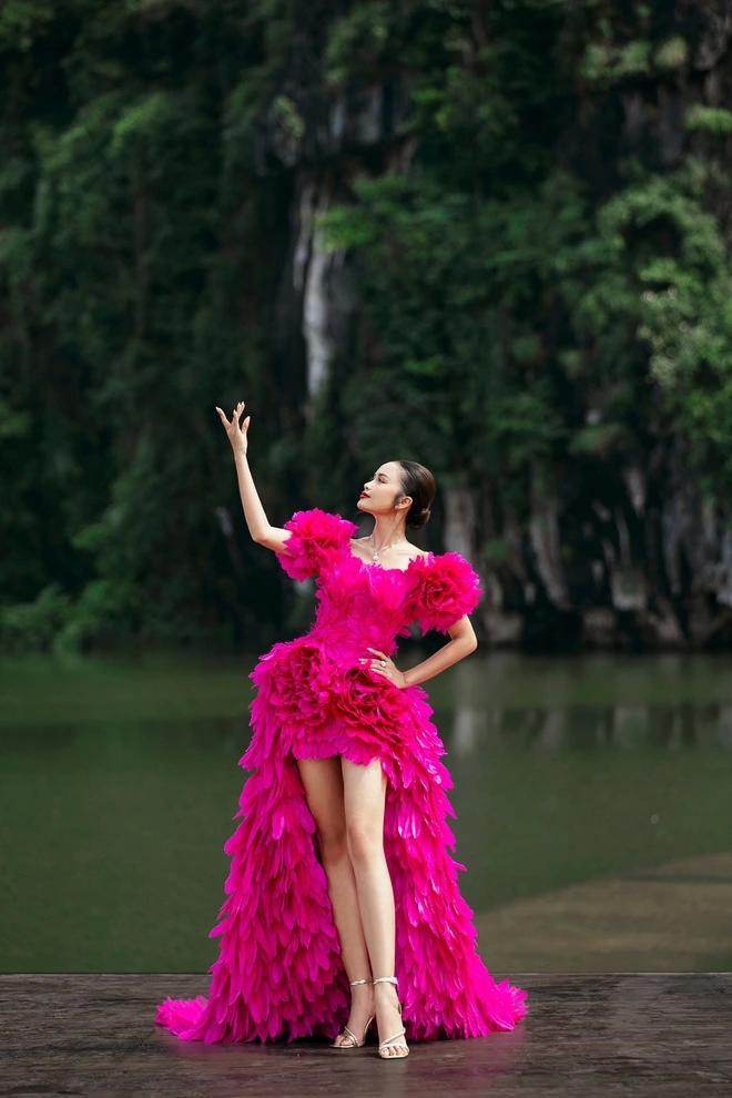 Ba hoa hậu Việt Nam mở màn trong vai trò first-face. Thay vì bước ra sàn catwalk từ phía sau sân khấu như thường lệ, ba người đẹp xuất hiện trên chiếc bè trúc, chậm rãi tiến về sàn diễn giữa âm nhạc du dương. Các nàng hậu thể hiện khả năng catwalk chuyên nghiệp cùng trang phục dạ hội có thiết kế tà dài và phom dáng dựng 3D công phu. ẢNH: KIẾNG CẬN TEAM