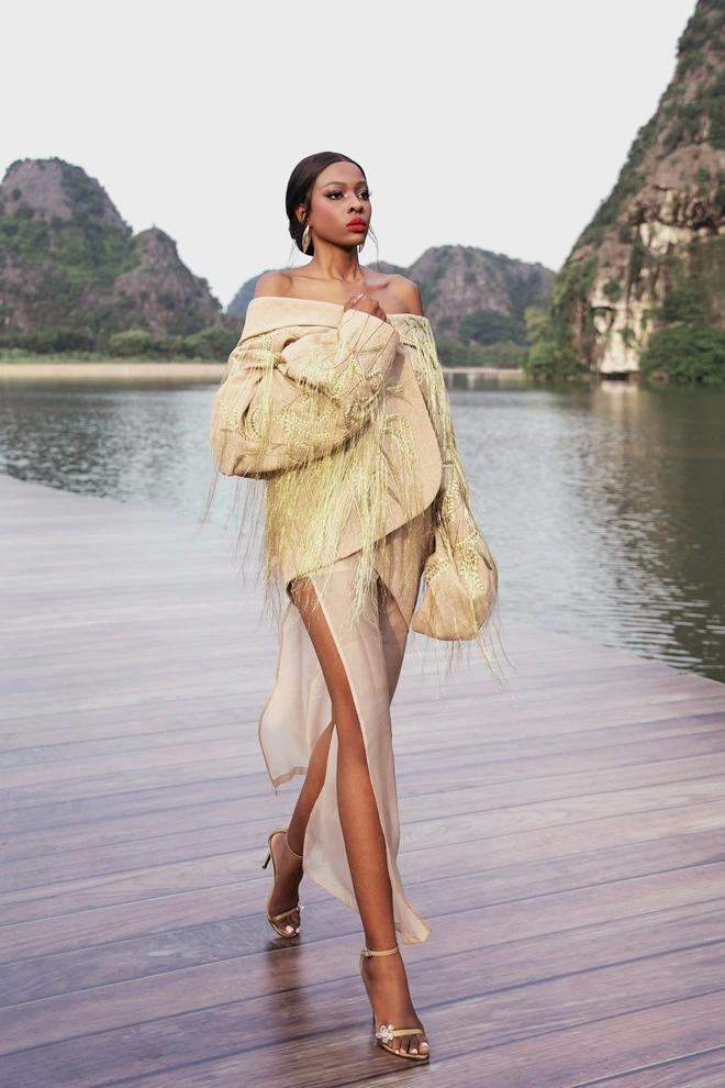 Tham gia trình diễn BST là bộ ba Hoa hậu Hoàn vũ Việt Nam H'Hen Niê, Ngọc Châu, Xuân Hạnh và 59 thí sinh Miss Cosmo 2024. Show diễn được đánh giá cao nhờ tính thẩm mỹ và những giá trị văn hóa dân tộc. Màn xuất hiện trên bè của ba người đẹp Việt gây thích thú và là điểm nhấn ấn tượng của show diễn. ẢNH: KIẾNG CẬN TEAM
